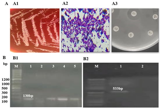 Phenotypic and molecular identification of MRSE: (A) phenotypic identification of MRSE; (A1) growth on blood agar; (A2) Gram staining showing Gram-positive cocci in clusters; (A3) antibiotic susceptibility on MHA agar; (B) molecular identification of MRSE; (B1) amplification of rdr (130 bp) for the detection of S. epidermidis (M: ladder; 1, 3, 4, 5: rdr-positive; 2: rdr-negative); (B2) amplification of mecA (533 bp) (M: ladder; 1: mecA-positive; 2: mecA-negative).