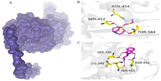 On the basis of high water solubility, high GI absorption, blood–brain barrier non-permeability, lack of toxicity, and drug-likeness, two compounds, including 1-ethylsulfanylmethyl-2,8,9-trioxa-5-aza-1-sila-bicyclo[3.3.3]undecane and Phthalimide, N-(1-hydroxy-2-propyl)-, were assessed for molecular interaction with PBP2a transpeptidase of MRSE. 1-Ethylsulfanylmethyl-2,8,9-trioxa-5-aza-1-sila-bicyclo[3.3.3]undecane interacts with Ser-452, Thr-584, and Asn-454 residues of PBP2a transpeptidase via hydrogen bonds. Similarly, phthalimide, N-(1-hydroxy-2-propyl)-formed four hydrogen bonds with PBP2a transpeptidase amino acid residues of Ser-396, Asn-454, Lys-399, and Ser-452 (Figure 3).