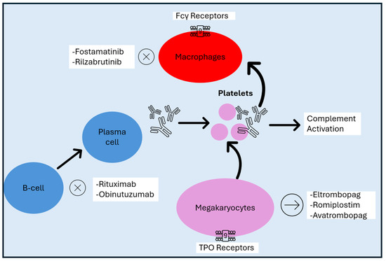 Autoantibodies might play a crucial role in the pathogenesis of ITP, but in up to 40% of ITP patients, antibodies against PLTs are not detectable, as shown in the metanalysis of Vrbensky et al. [62]. In such cases, defects in other components of the immune system might be implicated, such as in cytokines, chemokines, the complement system, and antigen-presenting, natural killer, and T cells [63,64,65,66,67,68]. In particular, the dysfunction of T cells might result in the desialylation of the PLTs [65]. In Figure 1, the basic process of ITP pathogenesis and the role of targeted therapeutics are summarized.