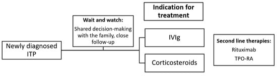 Treatment of pediatric ITP can be challenging since there are no clear guidelines and therapy varies, depending on the patient’s clinical status condition. In most cases, PLT counts in children normalize after some time. In cases where the condition is not improved, treatment is needed. ITP treatment options are categorized into front-line therapies (corticosteroids and IVIg) and second-line therapies (Rituximab and TPO-RA), which are preferred to treat chronic or refractory ITP [38]. In very severe and rare cases only, ITP can be life-threatening. Negative effects on the ITP patient’s QoL, especially in childhood, have been described [69].