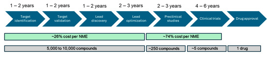 Schematic representation of the drug discovery and development pipeline. The first step is target identification, followed by target validation. Lead discovery is the next step and is generally pursued using high-throughput screening. Lead optimization is carried out before preclinical studies. The drug candidates selected from preclinical studies are taken to clinical trials, and a successful drug is approved for clinical usage.