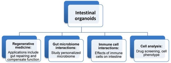 Uses of intestinal organoids. Intestinal organoids have a variety of common applications, including replacing or compensating for functional structures, mimicking host–microbe interactions, studying interactions with immune cell types, and investigating drug toxicity or developmental biology.