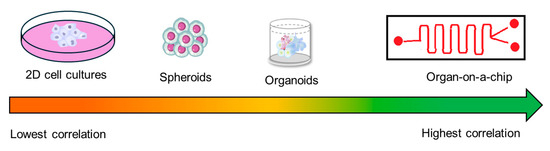 Clinically relevant in vitro models that demonstrate increased correlation to human biology. This progression is evident through the advancement from 2D cell culture models to 3D models like spheroids or organoids and ultimately to organ-on-a-chip models.