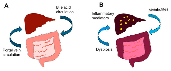 Gut–liver axis during normal conditions compared to conditions with metabolic dysfunction-associated fatty liver disease (MAFLD). (A) In normal conditions, there is bidirectional communication between the intestines and liver, known as the gut–liver axis, which helps maintain homeostasis. (B) However, under MAFLD conditions, factors originating in the gut, such as dysbiosis, leaky gut, and inflammatory cytokines, can impact the liver. Additionally, altered bile acid metabolites can affect gut function. An efficient organ-on-a-chip model can be used to represent this scenario [50].
