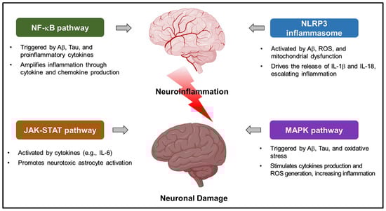 Neuroinflammation is orchestrated by a variety of molecular signaling pathways that regulate the activation and function of immune cells in the CNS. Key pathways include the NF-κB signaling cascade, the JAK-STAT pathway, the NLRP3 inflammasome, and MAPK signaling [32]. Each of these pathways can be activated by different stimuli, including infections, misfolded proteins, and cellular stress (Table 2, Figure 1).