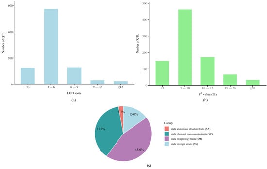 (a) Distribution of logarithm of odds (LOD) score, (b) distribution of R2 value or phenotypic variance explained (PVE), (c) classification of the traits. SA, stalk anatomical structure; SC, stalk chemical composition; SS, stalk strength.