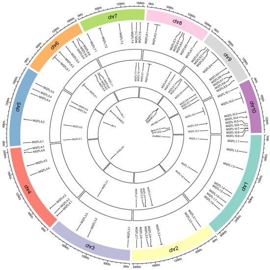 Meta-analysis of the 835 successfully mapped QTLs identified 67 MQTLs, each integrating 1–54 original QTLs (Table S3; Figure 2 and Figure S1). These 67 MQTLs were distributed across all 10 maize chromosomes, with chromosomal densities ranging from 3 MQTLs (chromosome 3) to 9 MQTLs (chromosomes 9 and 10).