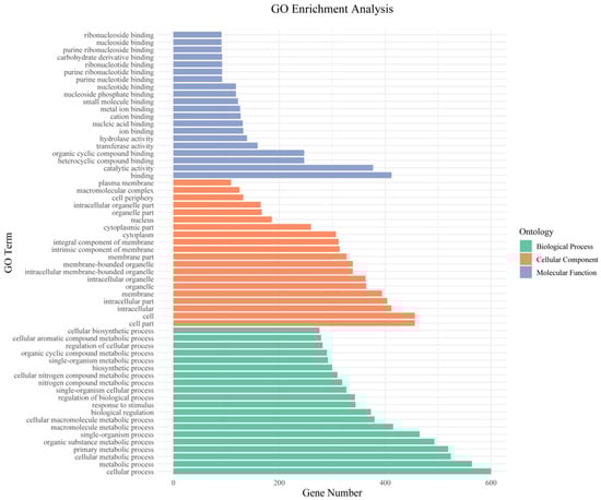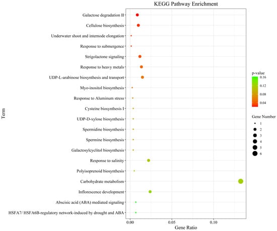 We next performed GO and KEGG pathway enrichment analysis of the identified 802 candidate genes to determine their functional classification. Among them, 601 genes had GO annotation (Figure 3). The most abundant GO terms related to biological processes were cellular processes (GO:000998, 600/601, 99.83%), metabolic processes (GO:0008152, 564/601, 93.84%) and cellular metabolic processes (GO:0044237, 524/601, 87.19%). GO terms related to molecular function—binding (GO:0005488, 412/601, 68.55%), catalytic activity (GO:0003824, 377/601, 62.73%) and heterocyclic compound binding (GO:1901363, 247/601, 41.10%)—were also highly enriched. Cell part (GO:0044464, 456/601, 75.87%), cell (GO:0005623, 456/601, 75.87%) and intracellular (GO:0005622, 412/601, 68.55%) were enriched in the cellular component’s annotation. The KEGG metabolic pathway is significantly enriched with metabolism and regulation, mainly involving carbohydrate metabolism: galactose degradation II, cellulose biosynthesis, UDP-L-arabinose biosynthesis and transport, and UDP-D-xylose biosynthesis; hormone signaling, transport, and metabolism: Strigolactone signaling; and secondary metabolism: galactosylcyclitol biosynthesis, Myo-inositol biosynthesis, and Polyisoprenoid biosynthesis (Figure 4).