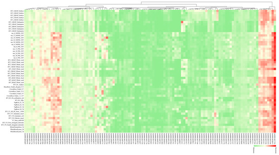 Expression patterns of candidate genes across developmental stages and tissues were analyzed using the qTeller database. Of 802 candidate genes, 601 exhibited detectable expression, with 406 showing high expression levels (Table S7). Here, we focused on 189 candidate genes (40 maize–rice orthologous genes and 149 candidate genes within the breeders’ MQTL regions), of which 114 candidate genes with highly specific expression in various tissues were visualized (Table S8; Figure 5). According to their different expression patterns, these 114 candidate genes were divided into three categories. In the first category, the expression levels were high in almost all tissues and stages. Among them, Zm00001d017526 had the highest expression in all tissues and is involved in multiple stress responses; Zm00001d038653, Zm00001d032346, Zm00001d021810, Zm00001d033186, Zm00001d021815, Zm00001d052494, and Zm00001d038658 were also highly expressed in all tissues. The second type was highly expressed only in some tissues: Zm00001d038648 and Zm00001d046112 are highly expressed in internode and root stages. The third type of gene was expressed in all tissues but the expression level was rather low.
