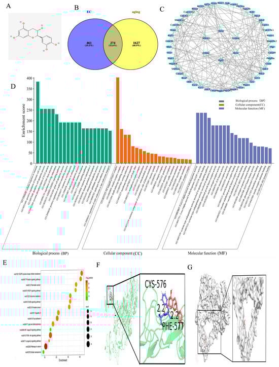 Results of network pharmacology and molecular docking. (A) 2D structural diagram of EC. The red O represents the oxygen element in the 2D structure of epicatechin. (B) Venn diagram illustrating the overlap between EC targets and aging—related genes. (C) Core components were identified by adopting Cytoscape 3.10.2 grounded in a median degree greater than 2, ultimately bringing about 54 paramount targets, comprising EGFR, ErbB4, NFKB1 and BCL2. (D) GO analysis of the 54 core targets revealed 15 enriched phrases related to molecular functions (MFs), cellular components (CCs) and biological processes (BPs). (E) KEGG pathway enrichment analysis unveiled critical pathways tightly correlated with anti-aging effects, such as the EGF receptor tyrosine kinase inhibitor resistance pathway, the PI3K-Akt signaling pathway and the cancer proteoglycan pathway. (F) As molecular docking results suggested, EC binds effectively to Neuregulin-1 (NRG1), illustrating a binding affinity of −2.68 kcal/mol. (G) Visualization via PyMOL confirmed stable interactions between EC and NRG1, which adequately demonstrates favorable binding activity.