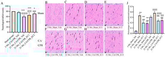 As illustrated in Table 1, the 21 Mo_CA/CPR_Veh group presented lower survival rates than the sham group. There were no discernible changes between the 3 Mo_CA/CPR_Veh, 21 Mo_CA/CPR_EC1 and 21 Mo_CA/CPR_EC2 groups. As demonstrated in Figure 2A, the neurological function score of the 21 Mo_CA/CPR_Veh group was considerably lower than that of the 21 Mo_CA/CPR_EC2 and 3 Mo_CA/CPR_Veh groups. Scores were higher for the Sham group than for the 21 Mo_CA/CPR_Veh and 21 Mo_CA/CPR_EC1 groups. Notwithstanding the fact that continuous EC delivery betters neurological outcomes in elderly animals subsequent to cerebral ischemia–reperfusion injury, our data suggest that, in contrast to young rats, naturally aged rats exhibit heightened susceptibility to such injury. Histological analysis via HE staining is summarized in Figure 2B–J: Figure 2B (3 Mo_Sham_Veh group): Normal cortical architecture with well-organized neurons and uniform staining. Figure 2C (21 Mo_Sham_Veh group): 33.26 ± 3.3% of the neurons presented pyknosis, with irregular morphology and elevated nuclear staining intensity. Figure 2D (21 Mo_Sham_EC1 group): Disordered neuronal arrangement and uneven staining; 21.14 ± 3.7% pyknotic neurons with lowered cell volume. Figure 2E (21 Mo_Sham_EC2 group): Mild cortical damage and relatively preserved neuronal organization; 18.43 ± 2.6% pyknotic neurons. Figure 2F (3 Mo_CA/CPR_Veh group): Significant augment in deeply stained neurons (31.31 ± 2.5%), which obviously suggests acute injury. Although this percentage remained greater than that in the 3 Mo_CA/CPR_Veh group, pyknotic neurons lowered to 38.52± 2.3%. Figure 2H (21 Mo_CA/CPR_EC1 group): Presence of deep neuronal staining and pyknosis; 24.07 ± 2.6% pyknotic neurons. Figure 2I (21 Mo_CA/CPR_EC2 group): Further reduction in pyknotic neurons (24.86 ± 2.7%). In contrast to the 3 Mo_Sham_Veh group, the 21 Mo_Sham_Veh, 21 Mo_Sham_EC1 and 21 Mo_Sham_EC2 groups presented more pyknotic neurons. In comparison with the 21 Mo_Sham_Veh group, the 21 Mo_Sham_EC1 and 21 Mo_Sham_EC2 groups presented fewer pyknotic neurons. There were more pyknotic neurons in the 21 Mo_CA/CPR_Veh group than in the 3 Mo_CA/CPR_Veh group. Neuronal pyknosis was considerably lower in the 21 Mo_CA/CPR_EC1 and 21Mo_CA/CPR_EC2 groups than in the 21 Mo_CA/CPR_Veh group.