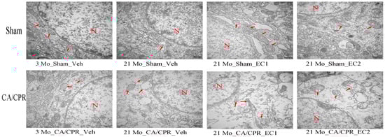In line with ultra-structural studies, the aging groups presented significant mitochondrial damage. Figure 3: In comparison with those in the 3 Mo_Sham_Veh, 21 Mo_Sham_EC1 and 21 Mo_Sham_EC2, the mitochondria in the 21 Mo_Sham_Veh group presented vacuolar degeneration, lowered electron density and matrix thinning. In the CA/CPR group, the mitochondria in the 21 Mo_CA/CPR_Veh subgroup presented severe structural alterations, comprising crista disintegration, rupture and loss, as well as disrupted neuronal membranes. Comparison of mitochondrial structure between CA/CPR aging group (21 Mo_CA/CPR_Veh, 21 Mo_CA/CPR_EC1 and 21 Mo_CA/CPR_EC2) with that of sham aging group (21 Mo_Sham_Veh, 21 Mo_Sham_EC1 and 21 Mo_Sham_EC2) demonstrated that CA/CPR group shows more mitochondrial vacuolization, crista disorganization and membrane rupture, along with more pronounced neuronal membrane incompleteness, which evidently demonstrated exacerbated mitochondrial and cellular injury in aged animals subsequent to CA/CPR.