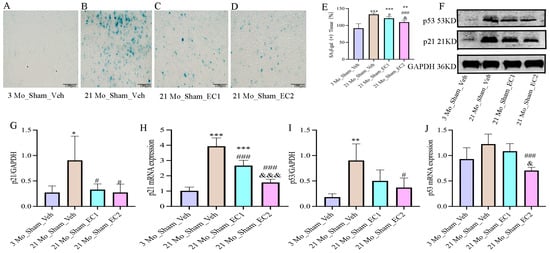 SA-β-gal staining and the protein and mRNA expression levels of p53 and p21. (A–D) A representation of the proportion of SA-β-gal-stained regions. Scale bar: 100 μm (400×). (E) SA-β-gal (+) Tissue (%). (F) The WB bands of the senescence-related proteins p21 and p53. (G–J) The statistical map of p21 and p53 WB and mRNA statistical analysis. All data are presented as the Mean ± SD. * p < 0.05, ** p < 0.01, *** p < 0.001 vs. 3 Mo_Sham_Veh group; # p < 0.05, ### p < 0.001 vs. 21 Mo_Sham_Veh group; & p < 0.05, &&& p < 0.001 vs. 21 Mo_Sham_EC1 group.