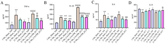 The anti-inflammatory cytokine IL-10 was less pronounced, and the proinflammatory cytokines TNF-α, IL-1β and IL-6 were greater in the 21 Mo_Sham_Veh group than in the 3 Mo_Sham_Veh group. On the other hand, the 21 Mo_Sham_EC2 group displayed more significant levels of IL-10 and lower levels of IL-1β and IL-6 than the 21 Mo_Sham_Veh group. Figure 5A–D: In contrast to the 3 Mo_CA/CPR_Veh group, the 21 Mo_CA/CPR_Veh group in the CA/CPR group presented considerably higher levels of TNF-α and IL-1β, whereas the level of IL-10 was less significant. It is tremendously noteworthy that in comparison with the 21 Mo_CA/CPR_EC2 group, the 21 Mo_CA/CPR_EC2 group presented lowered IL-1β and IL-6 levels, with a concomitant heightening IL-10.