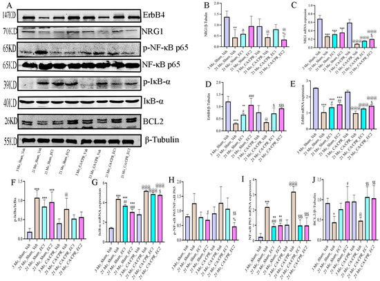 Figure 6 A depicts representative Western blot images of NRG1, ErbB4, p-IκBα, IκBα, p-NF-κBp65, NF-κBp65 and BCL2. Age-related downregulation of this signaling axis was demonstrated by the considerably lower expression of both NRG1 and ErbB4 in the 21 Mo_Sham_Veh group than in the 3 Mo_Sham_Veh group in the Sham group (Figure 6B,D,F,H). Concurrently, there was a significant elevation in the ratios of p-IκBα/IκBα and p-NF-κBp65/NF-κBp65, which apparently illustrated that the NF-κB pathway was activated throughout the process of normal aging. Both the 21 Mo_Sham_EC1 and 21 Mo_Sham_EC2 groups presented higher levels of NRG1 and ErbB4 than the 21 Mo_Sham_Veh group did, suggesting that long-term EC administration may be advantageous for the repeated expression of the aforementioned proteins among elderly rats. Apart from that, the phosphorylation levels of IκBα and NF-κBp65 were lessened in these groups, illustrating that EC conducts a pivotal role in suppressing NF-κB signaling and alleviating age-associated inflammation. A similar pattern was observed in the CA/CPR groups (Figure 6B,D,F,H). NRG1 and ErbB4 expression was lower in the 21 Mo_CA/CPR_Veh group than in the 3 Mo_CA/CPR_Veh group, while the p-IκBα/IκBα and p-NF-κBp65/NF-κBp65 ratios were greater. NRG1 and ErbB4 expression, nevertheless, was more significant in the EC-treated groups (21 Mo_CA/CPR_EC1 and 21 Mo_CA/CPR_EC2) than in the 21 Mo_CA/CPR_Veh group. Furthermore, the 21 Mo_CA/CPR_EC2 group presented a pronounced abatement in both phosphorylation markers in comparison with the 21 Mo_CA/CPR_Veh group, illustrating that EC inhibits NF-κB activation subsequent to CA/CPR in elderly animals. As displayed in Figure 6C,E,G,I, the mRNA expression levels of NRG1, ErbB4, p-IκBα and p-p65 corresponded with the corresponding protein data for both the CA/CPR and Sham groups. As depicted in Figure 6J, BCL2 expression was up-regulated in the 21 Mo_CA/CPR_EC1 and 21 Mo_CA/CPR_EC2 groups in contrast to that in the 21 Mo_CA/CPR_Veh group, demonstrating that EC treatment reinforced antiapoptotic activity. On top of that, BCL2 expression was considerably lower in the 21 Mo_Sham_Veh group than in the 21 Mo_Sham_EC2 group, revealing that oral gavage of EC for an extended period provides more satisfactory protection against apoptosis than does ordinary water consumption.