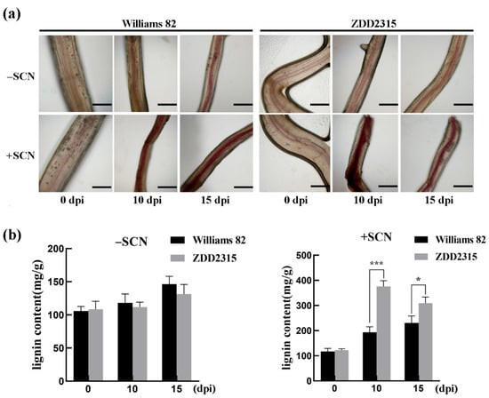 Lignin accumulation in Williams 82 and ZDD2315 roots following SCN3 inoculation. (a) Representative images depict phloroglucinol-HCl staining of lignin in roots sampled at 0, 10, and 15 days post-inoculation (dpi). Bar: 1 cm. (b) Measurement of lignin content in soybean roots before and after SCN inoculation. Asterisks denote statistical significance: * p < 0.05, *** p < 0.001. Data represent three biological replicates.