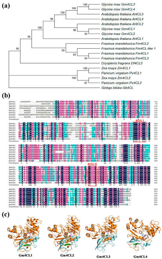 Sequence analysis of 4CL. (a) Phylogenetic tree of the 4CL gene family. Branches indicate evolutionary relationships among Gm4CL1 (Glyma.17g064600), Gm4CL2 (Glyma.13g372000), Gm4CL3 (Glyma.11g010500), and Gm4CL4 (Glyma.01g232400) from Glycine max; At4CL1 (AT1G51680), At4CL2 (AT3G21240), At4CL3 (AT1G65060), and At4CL4 (AT1G20500) from Arabidopsis thaliana; Zm4CL1 (NM_001111788) and Zm4CL2 (NM_001156842) from Zea mays; Pv4CL1 (EU491511.1) and Pv4CL2 (JF414903.1) from Panicum virgatum; Fm4CL1 (KJ531400.1), Fm4CL2 (KJ531401.1), Fm4CL3 (KJ531402.1), and Fm4CL-like1 (KJ531403.1) from Fraxinus mandshurica; Df4CL2 (KF836752.1) from Dryopteris fragrans; Gb4CL (KU820947.1) from Ginkgo biloba. (b) Multiple amino-acid alignment of soybean 4CL paralogs (Gm4CL1-4) and Arabidopsis 4CL (At4CL1-4). Red boxes highlight the conserved BOX I (SSGTTGLPKGV) and BOX II (GEICIRG) motifs. (c) Homology modeling: Four Gm4CL isoforms were modeled with SWISS-MODEL using Arabidopsis At4CL (PDB: 3tsy.1) as the template. The conserved BOX I (pink) and BOX II (green) motifs are highlighted.