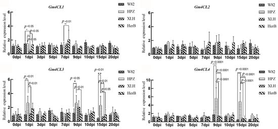 To systematically evaluate the dynamic contribution of the 4CL gene family to soybean defense against SCN, we conducted a time-course expression analysis of Gm4CL1–Gm4CL4 in four representative genotypes: the resistant cultivar ZDD2315/HPZ, the susceptible cultivar Williams 82, and two intermediate lines (ZDD1412/XLH and ZDD7170/HerB). Following SCN3 inoculation, Gm4CL1 and Gm4CL2 showed no significant differences among the four cultivars in root tissues from 0 to 20 dpi (Figure 3). This suggests that these two genes are unlikely to be directly involved in root-mediated SCN resistance.