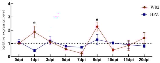 Relative expression of GmPOD53 under SCN stress in susceptible Williams 82 (W82), and resistant ZDD2315 (HPZ) soybean cultivars. Data are presented as means ± SD. Asterisks indicate statistical significance: * (p < 0.05).