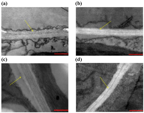Effect of Gm4CL over-expression on cell-wall thickness. Transmission electron microscopy images of Nicotiana benthamiana leaves transiently transformed with Gm4CL1–4 constructs. Scale bar = 500 nm; magnification 15 k× (Hitachi TEM). (a) PCAMBIA1302-GFP empty vector, (b) suspension buffer control, (c) PCAMBIA1302-GFP-Gm4CL3, and (d) PCAMBIA1302-GFP-Gm4CL4, respectively. Yellow arrow represents secondary cell wall.
