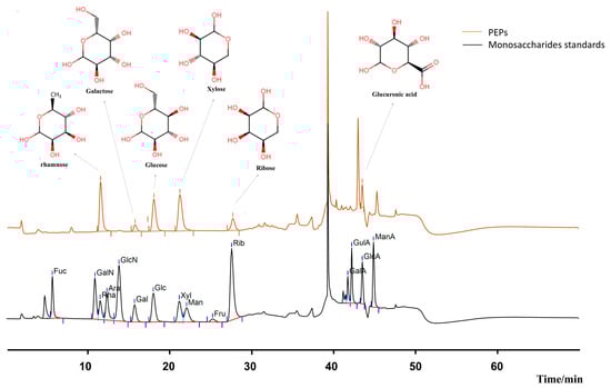 The monosaccharide composition of PEPs. (N-Acetyl-D-glucosamine will decompose under hydrolysis conditions at 120 °C, so it cannot be presented in the mixed standard chromatogram).