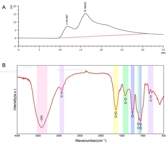 y = −0.5926x + 13.192, R2 = 0.9943 for LgMp-RT; y = −0.5995x + 13.286, R2 = 0.9944 for LgMw-RT; and y = −0.5965x + 13.237, R2 = 0.9933 for LgMn-RT. Subsequently, dissolve 5 mg of PEPs in 1 mL of the mobile phase, followed by sonication for 10 min, centrifugation at 12,000 rpm for 10 min, and filtration of the supernatant through a 0.22 μm filter membrane. By substituting the retention times of PEPs into the formula, molecular weights (Mp, Mw, Mw) can be obtained. The detection results are plotted with retention time on the x-axis and differential signal on the y-axis.