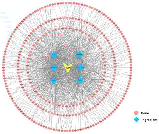 The primary active components of PEPs and the central targets were chosen based on the overlapping targets for molecular docking. Firstly, the SDF structure file of the core components was obtained from the PubChem database and converted to a PDB format file using Open Babel 2.3.2. The target proteins were then pretreated. The 3D structure file of the protein target in PDB format was retrieved from the PDB database (https://www.rcsb.org/, accessed on 6 May 2025). Subsequently, the protein target underwent processing, including desolvation, hydrogenation, and setting of appropriate active pockets and docking parameters using the AutoDockTools 1.5.7 software. Molecular docking simulations were performed using the “AutoDock Vina” module. The docking method employed was semi-flexible docking with an exhaustiveness setting of 20. PyMOL 3.1.0 software was used for visualization and analysis.