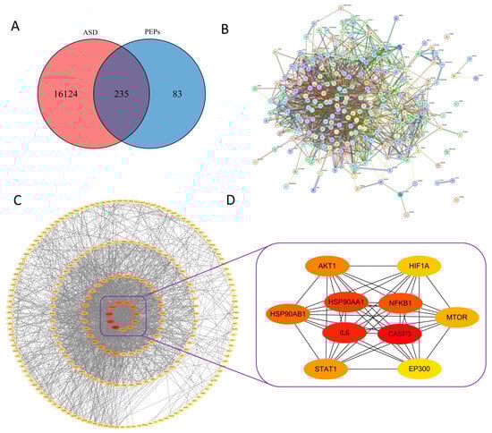 PPI network analysis of ASD-related PEPs targets. (A) Venn diagram shows identification of ASD-related PEPs targets. (B) PPI network of potential ASD-related PEPs targets. (C) Interaction network of ASD-related PEPs target proteins. Darker color indicates more critical targets. (D) Core target PPI diagram. The core genes were screened based on the Maximum Clique Centrality algorithm. Darker color indicates more critical targets.
