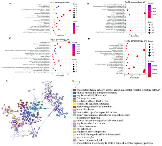 KEGG and GO functional enrichment analysis of ASD-related PEPs target genes. (A) KEGG pathway enrichment analysis shows the potential pathways targeted by PEPs related to ASD. (B) GO enrichment analysis shows the molecular functions (MF) enriched by the ASD-related PEPs target genes. (C) GO enrichment analysis of biological processes (BP) enriched by the ASD-related PEPs target genes. (D) GO enrichment analysis of cellular components (CC) enriched by the ASD-related PEPs target genes. (E) MCODE analysis of core target genes for PEPs. Enrichment results are displayed by the network plot. The node size indicates the degree of enrichment.