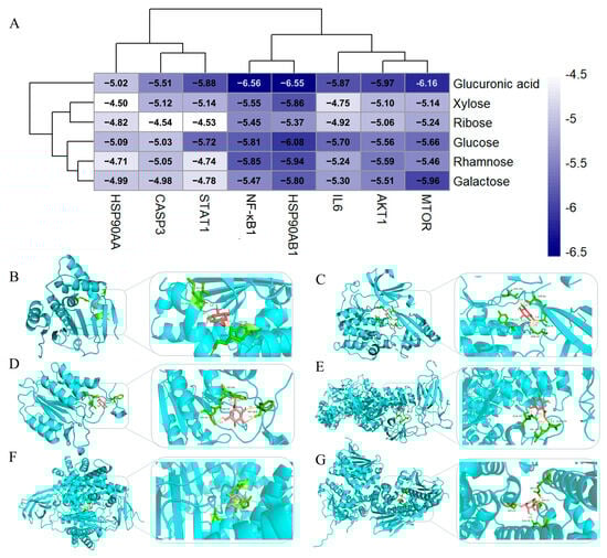 Molecular docking results. (A) Molecular docking energy of PEPs target proteins. (B) Visualization of docking results between glucose and HSP90AA1. (C) Visualization of docking results between glucuronic acid and AKT1. (D) Visualization of docking results between glucuronic acid and CASP3. (E) Visualization of docking results between glucuronic acid and NF-κB1. (F) Visualization of docking results between glucuronic acid and mTOR. (G) Visualization of docking results between rhamnose and HSP90AB1.