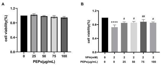 Cytotoxicity and anti-VPA effects of PEPs on the HT22 cells (n = 3/each group). (A) Effects of different concentrations of PEPs on the viability of HT22 cells. (B) Effects of different concentrations of PEPs on the viability of HT22 cells treated with 2 mM VPA compared with the model group (VPA-treatment group). **** p < 0.0001 vs. the control; # p < 0.05, ## p < 0.01 vs. model group (VPA treatment group).