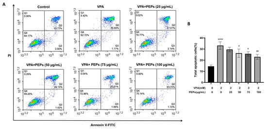 Effects of PEPs on VPA-induced apoptosis in HT22 cells (n = 3/each group). (A) Flow cytometry analysis results show the effects of apoptosis in the VPA-treated HT22 cells. (B) Statistical analysis of data on HT22 cell apoptosis induced by VPA in PEPs. **** p < 0.0001 vs. the control, # p < 0.05, ## p < 0.01 vs. the VPA.