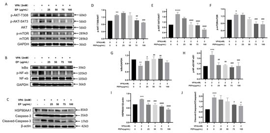 Western blot analysis shows the effects of different concentrations of PEPs on the expression levels of key target proteins in HT22 cells (n = 3/each group). (A) The Western blot image of p-AKT-T308, p-AKT-S473, AKT, p-mTOR, and mTOR proteins. (B) The Western blot image of lκBα, p-NF-κB, and NF-κB proteins. (C) The Western blot image of the expression levels of HSP90AA1, Caspase3, and Cleaved-Caspase3. (D–J) Protein expression levels of p-AKT-T308/AKT, p-AKT-S473/AKT, p-mTOR/mTOR, lκBα, HSP90AA1, and Cleaved-Caspase3/Caspase3. * p < 0.05, ** p < 0.01, *** p < 0.001, **** p < 0.0001 vs. the control, # p < 0.05, ## p < 0.01, ### p < 0.001, #### p < 0.0001 vs. the VPA.
