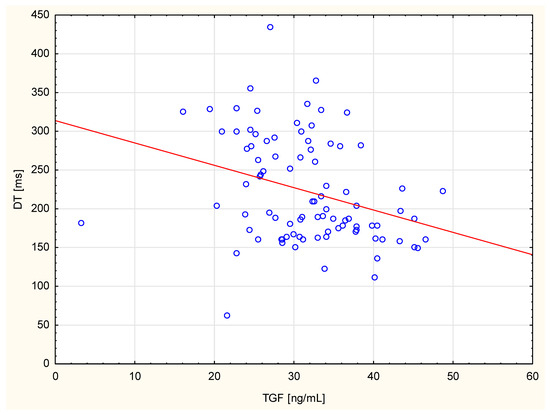 Table 3 shows the correlations between echocardiographic parameters and TGF-β1 concentrations in the circulation. Using the standard significance criterion (p = 0.05), positive correlations between right ventricular end–diastolic diameter, left ventricular end–diastolic diameter, left ventricular end–systolic diameter, left ventricular end–diastolic volume, LVMI, and TGF-β1 level were found. The negative correlations were found between right ventricular mean systolic pressure, FS, DT, and TGF-β1 levels. However, after applying the Bonferroni correction, only the negative correlation between TGF-β1 concentration and deceleration time remained statistically significant. These data are highlighted in green in the table. Figure 1 shows TGF correlation with only one statistically significant parameter after Bonferroni correction, the deceleration time.
