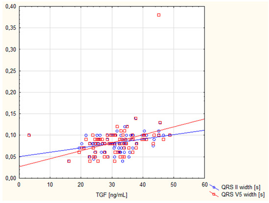 Table 4 shows the correlations between TGF-β1 concentration in the bloodstream and ECG parameters. There is a positive correlation between TGF-β1 and QRS II width and QRS V5 width, with high statistical significance. After the Bonferroni correction, these correlations did not lose their statistical significance. These data are highlighted in green in the table. Furthermore, no statistically significant associations were found between plasma TGF-β1 concentration and any of the electrocardiography parameters, except the negative correlation of TGF-β1 with RV5(6) amplitude (p < 0.05). Figure 2 shows TGF correlations with only statistically significant parameters after Bonferroni correction: the QRS II and V5 widths.