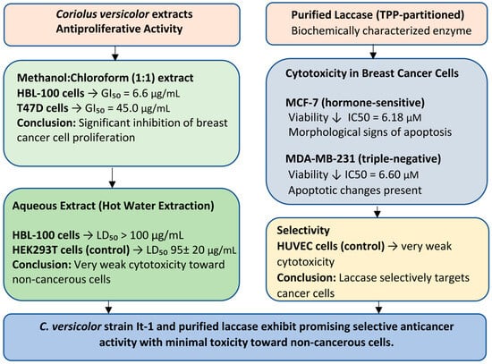 Block diagram summarizing the antiproliferative and cytotoxic effects of Coriolus versicolor extracts and purified laccase. The methanol–chloroform extract showed significant growth inhibition in breast cancer cell lines, while aqueous extracts were very weakly toxic to non-cancerous cells. Purified laccase significantly reduced the viability of breast cancer cells and had little effect on healthy endothelial cells, indicating the potential for safe and targeted anticancer therapy.