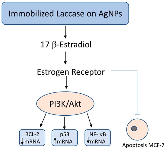 The antitumor activity of immobilized laccase was also studied at the molecular level by comparing the mRNA expression of the apoptosis-related genes BCL-2 (B-cell CLL/lymphoma 2), p53 (tumor protein 53), and NF-kβ (NF-κB (Nuclear Factor kappa B) in MCF-7 cells. A decrease in the levels of BCL-2 and NF-kβ mRNA by 81 and 88%, respectively, and a 3.6-fold increase in the level of p53 mRNA were observed compared to the control sample. Thus, MCF-7 cells of hormone-dependent cancer in the presence of laccase immobilized on silver nanoparticles stabilized with Pluronic polymer undergo apoptosis due to the reduced availability of 17β-estradiol for ER (estrogen receptors) and the change in the apoptosis signaling pathway PI3K/Akt, (phosphatidyl inositol 3-kinase/v-akt murine thymoma viral oncogene homolog 1 phosphatidylinositol 3-kinase/protein kinase AKT) directly regulated by the level of gene expression for BCL-2, p53 and NF-kβ [].