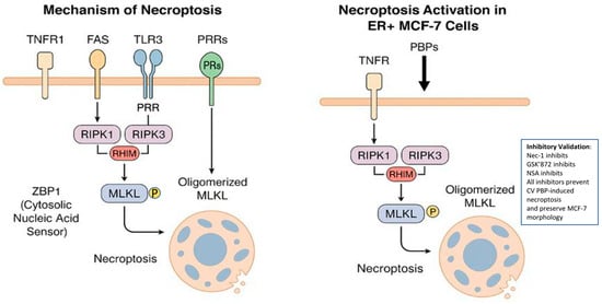 Thus, PBPs from CV activate the RIPK1/RIPK3/MLKL axis, triggering necroptotic death in ER+ cells independently of ROS []. The induction of necroptosis has emerged as a promising alternative strategy in anticancer therapy. In vitro studies by Pawlikowska et al. [] have uncovered novel molecular mechanisms through which PBPs exert their effects on cancer cells. Despite the clinical relevance of these compounds, additional in vivo investigations are necessary to validate their therapeutic potential (Figure 3).