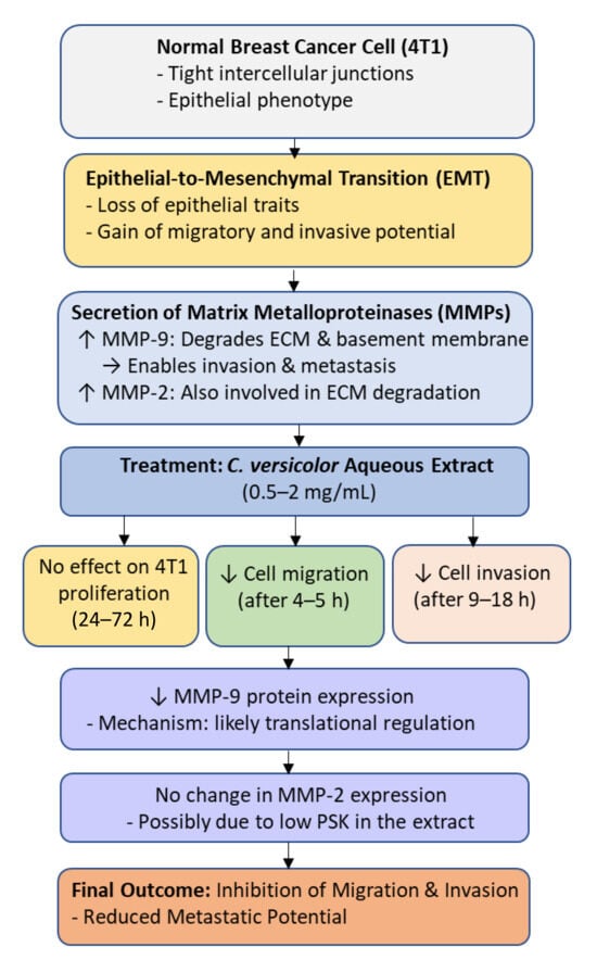 Molecular mechanism underlying the anti-migratory and anti-invasive effects of Coriolus versicolor aqueous extract on breast cancer cells (4T1). Treatment with the extract (0.5–2 mg/mL) inhibits epithelial-to-mesenchymal transition (EMT) and reduces cell migration and invasion by downregulating MMP-9 protein expression without affecting MMP-2 or cell proliferation. The inhibition of MMP-9 likely occurs at the translational level, leading to suppression of extracellular matrix (ECM) degradation and reduced metastatic potential.
