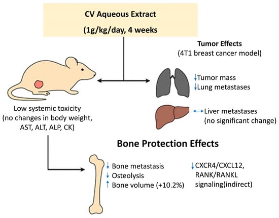 Administration of an aqueous extract of CV to mice with 4T1 tumors induced a protective effect on bone structure and an increase in its volume by 10.2%. The anti-osteolytic effect could result from the anti-tumor activity of the extract, reducing the metastasis of breast cancer cells to the bone, which consequently translates into the protection of the bone structure [] (Figure 5).