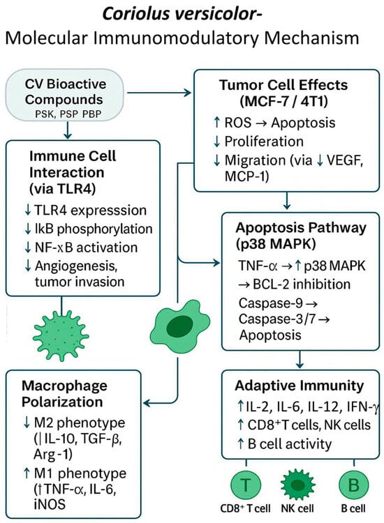 Kowalczewska et al. (2016) [] conducted studies to assess the immunomodulatory and anticancer properties of polysaccharide peptides extracted from commercially available C. versicolor capsules (MycoMedica, Czech Republic) on an in vitro research model of MCF-7 breast cancer cells. Based on the obtained results, it was established that the tested PBPs at a concentration of 100 mg/mL inhibited the proliferation of MCF-7 cells after 48 h of exposure. Moreover, it was found that the level of IL-1b, IL-6 mRNA in MCF-7 cells after 18 h of incubation with PBP (100 and 300 µg/mL) from CV decreased compared to control cells. Interestingly, after 24 h, the level of IL-6 mRNA expression increased by 6.93 ± 0.99 times higher than the control. A significant increase (by 41.48 ± 3.99 times) in the level of TNF-α (tumor necrosis factor α) mRNA expression in MCF-7 cells was noted after 24 h of PBP stimulation at a dose of 100 µg/mL. It has been established that TNF-α can activate p38 MAPK kinase and thus induce apoptosis in the cell. p38 MAPK (mitogen-activated protein kinase) kinase phosphorylates BCL-2 protein, blocking its antiapoptotic activity. As a consequence, this leads to the activation of caspase-9 and then 3 and 7 []. The authors found that the apoptotic effect in MCF-7 cells induced by polysaccharide peptides isolated from the CV fungus may be the result of direct action of PBP components on MCF-7 cells or indirect action through TNF-α receptors [].