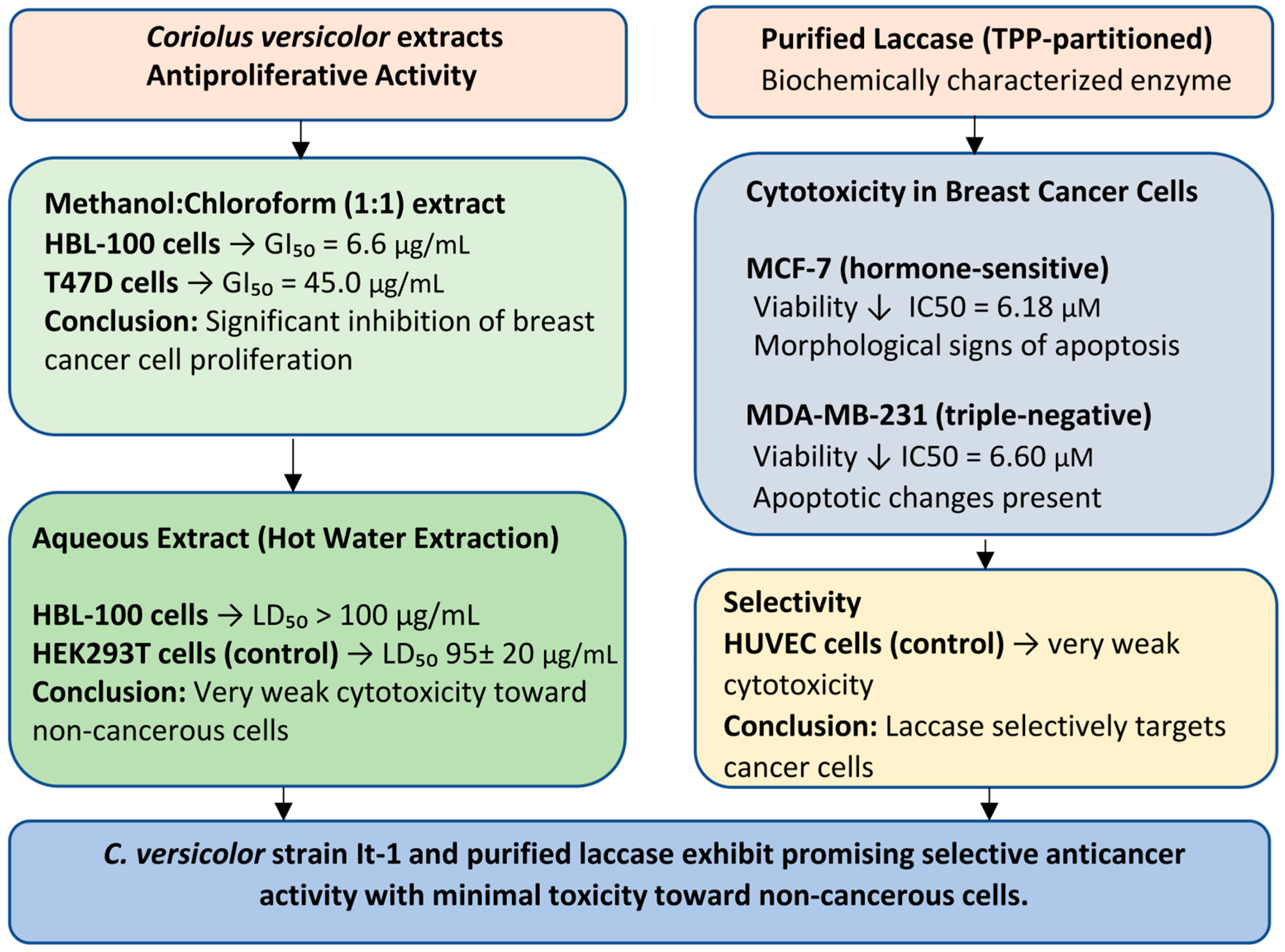 Figure 1. Block diagram summarizing the antiproliferative and cytotoxic effects of Coriolus versicolor extracts and purified laccase. The methanol–chloroform extract showed significant growth inhibition in breast cancer cell lines, while aqueous extracts were very weakly toxic to non-cancerous cells. Purified laccase significantly reduced the viability of breast cancer cells and had little effect on healthy endothelial cells, indicating the potential for safe and targeted anticancer therapy.