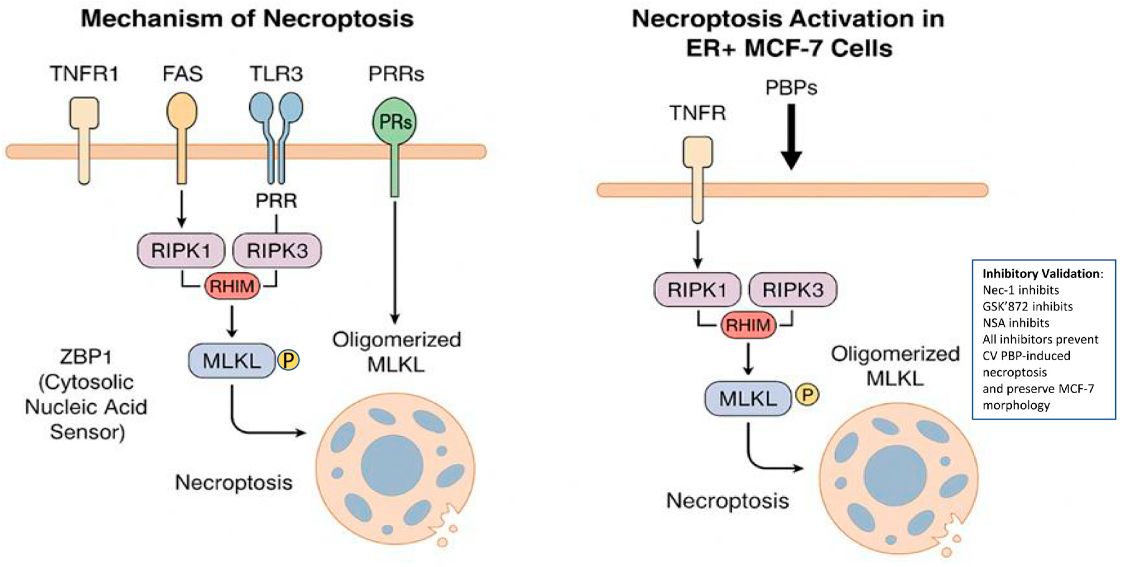 Figure 3. Molecular mechanism of necroptosis and its induction in ER-positive MCF-7 breast cancer cells by protein-bound polysaccharides (PBPs) from Coriolus versicolor. Left panel: Schematic representation of the canonical necroptosis signaling pathway. The process is initiated via tumor necrosis factor receptor 1 (TNFR1), FAS, Toll-like receptors (TLR3/4), or cytosolic pattern recognition receptors (ZBP1). Activation of RIPK1 and RIPK3 through RIP homotypic interaction motif (RHIM)-dependent interactions leads to MLKL phosphorylation. Phosphorylated MLKL oligomerizes and translocates to the plasma membrane, culminating in membrane rupture and cell death. Right panel: PBPs from C. versicolor trigger necroptosis in estrogen receptor-positive (ER+) MCF-7 cells by stimulating the TNF/TNFR-RIPK1/RIPK3/MLKL axis independently of reactive oxygen species (ROS). Pharmacological inhibition of RIPK1, RIPK3, or MLKL abrogates this process, confirming the involvement of this specific signaling cascade.