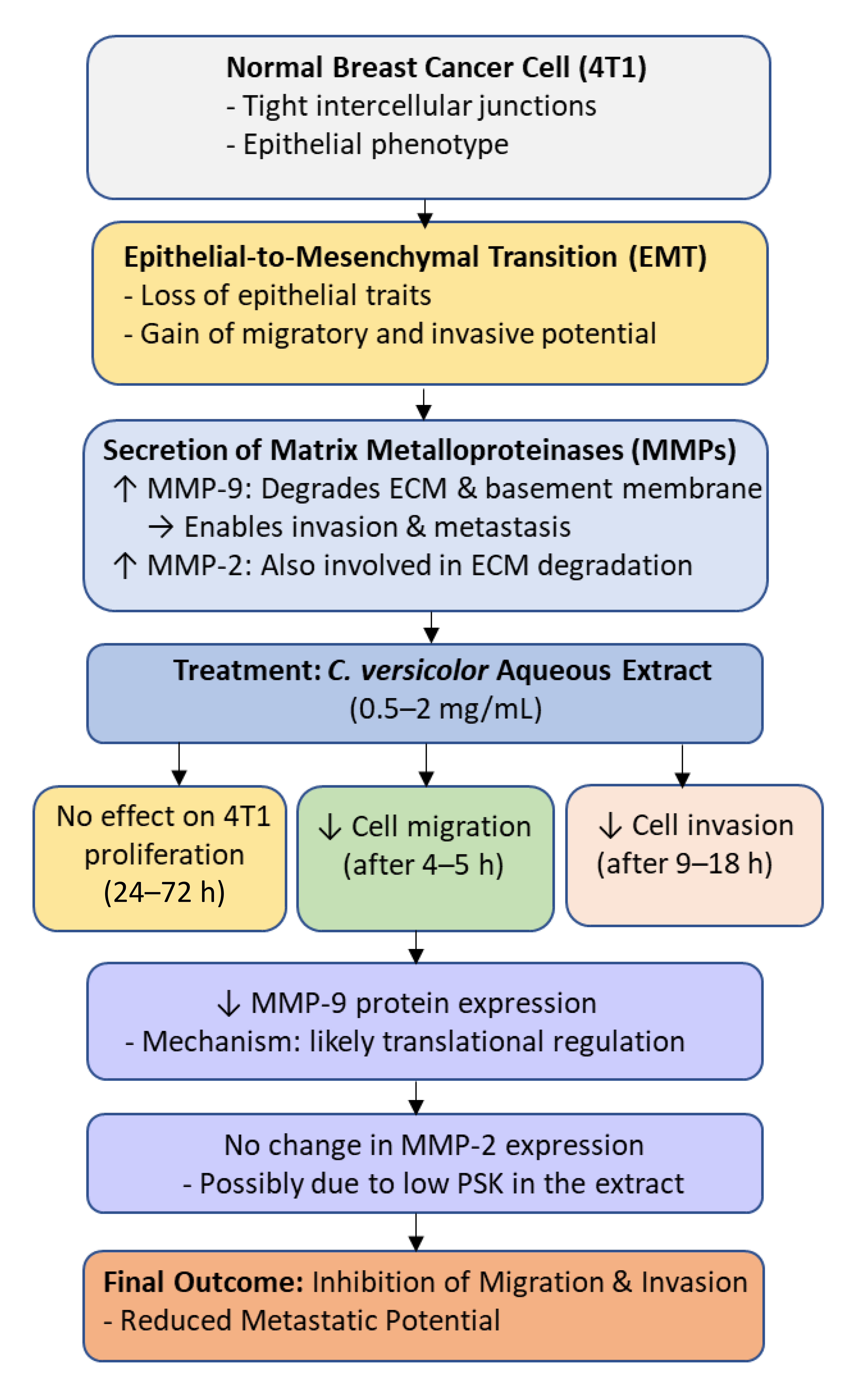 Figure 4. Molecular mechanism underlying the anti-migratory and anti-invasive effects of Coriolus versicolor aqueous extract on breast cancer cells (4T1). Treatment with the extract (0.5–2 mg/mL) inhibits epithelial-to-mesenchymal transition (EMT) and reduces cell migration and invasion by downregulating MMP-9 protein expression without affecting MMP-2 or cell proliferation. The inhibition of MMP-9 likely occurs at the translational level, leading to suppression of extracellular matrix (ECM) degradation and reduced metastatic potential.