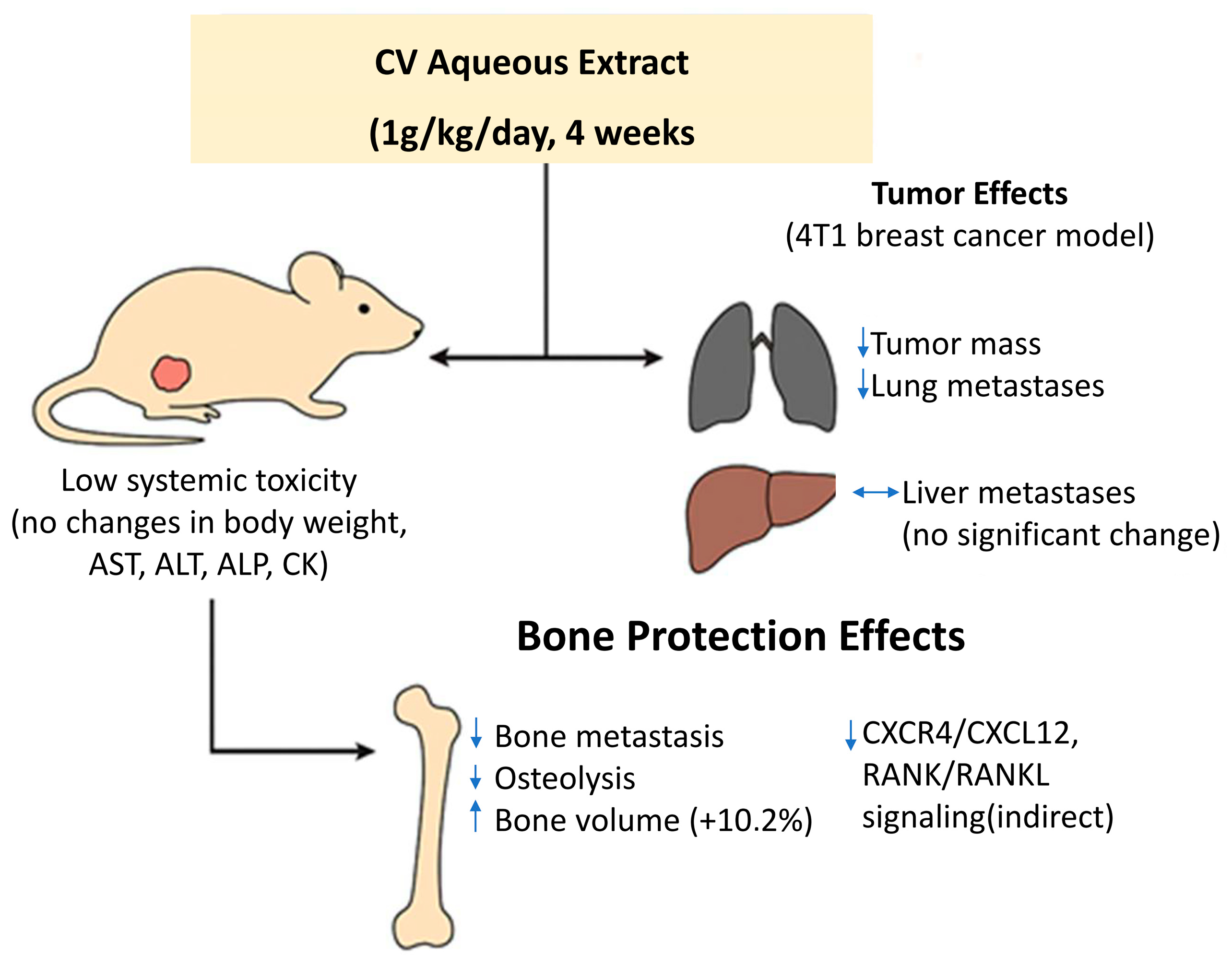 Figure 5. In vivo antimetastatic and anti-osteolytic effects of aqueous extract of Coriolus versicolor (CV) in a murine 4T1 breast cancer model. Daily oral administration of CV extract (1 g/kg for 4 weeks) significantly reduced primary tumor mass and lung metastases, without affecting liver metastasis. The treatment was well tolerated, with no changes in body weight or plasma enzyme activity (AST, ALT, ALP, CK), indicating low systemic toxicity. Additionally, CV extract exerted a protective effect on bone structure by reducing bone metastasis and osteolysis, increasing bone volume by 10.2%. These effects may result from indirect inhibition of CXCR4/CXCL12 and RANK/RANKL signaling pathways involved in bone colonization.