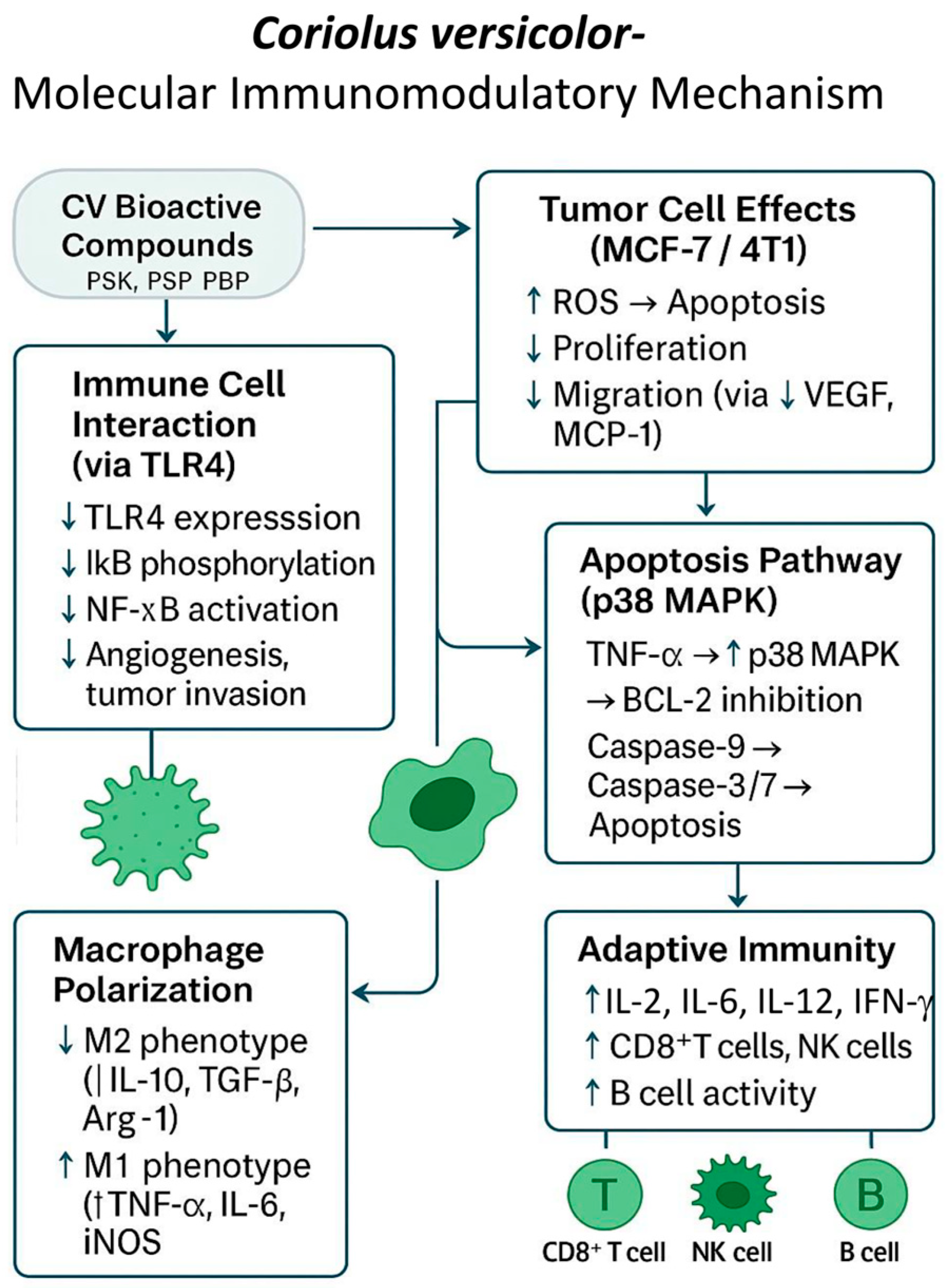 Figure 6. Molecular immunomodulatory mechanism of Coriolus versicolor (CV) bioactive compounds in the tumor microenvironment. CV-derived protein-bound polysaccharides (PSK, PSP, PBP) modulate immune responses by inhibiting TLR4/NF-κB signaling, reducing pro-inflammatory cytokines (IL-6, IL-8), and suppressing angiogenesis and metastasis via downregulation of VEGF, MCP-1, and MMP-9. CV promotes apoptosis in cancer cells through the p38 MAPK pathway and enhances M1 macrophage polarization (↑TNF-α, IL-6, iNOS), while inhibiting M2 phenotype markers (↓IL-10, TGF-β, Arg-1). Additionally, it stimulates adaptive immunity by increasing IL-2, IL-12, IFN-γ, and the activity of CD8+ T cells, B cells, and NK cells, collectively reshaping the tumor microenvironment toward antitumor immunity.