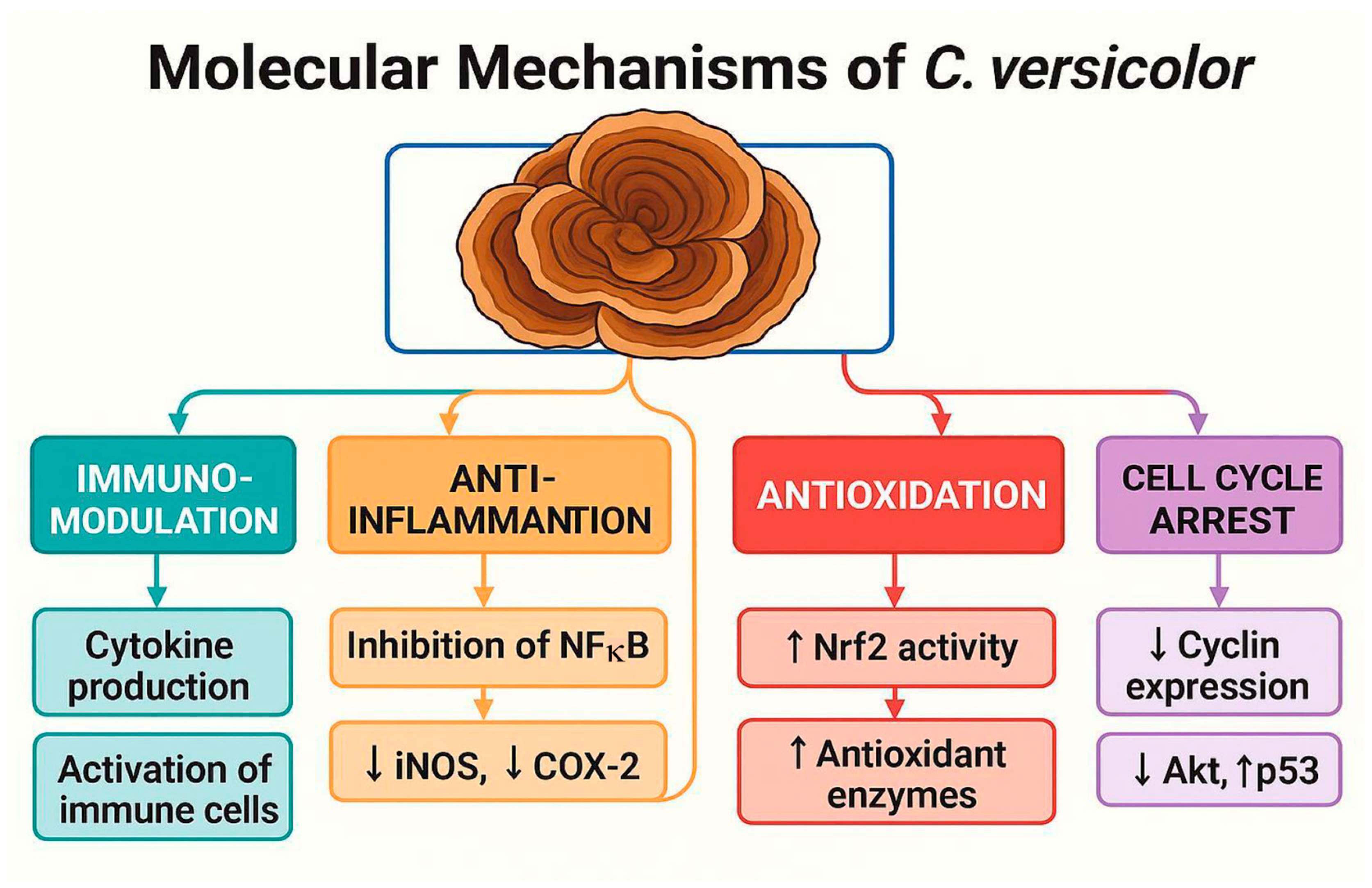 Figure 7. Molecular Mechanisms of Coriolus versicolor in Cancer Therapy. Schematic representation of the key biological effects of C. versicolor and its bioactive compounds. The mushroom exerts immunomodulatory effects by enhancing cytokine production and activating immune cells; anti-inflammatory effects through NF-κB inhibition and suppression of iNOS and COX-2; antioxidative effects by upregulating Nrf2 and antioxidant enzymes; and cell cycle arrest via downregulation of cyclins, Akt signaling, and upregulation of p53. These mechanisms contribute to its antitumor potential and therapeutic relevance in oncology.