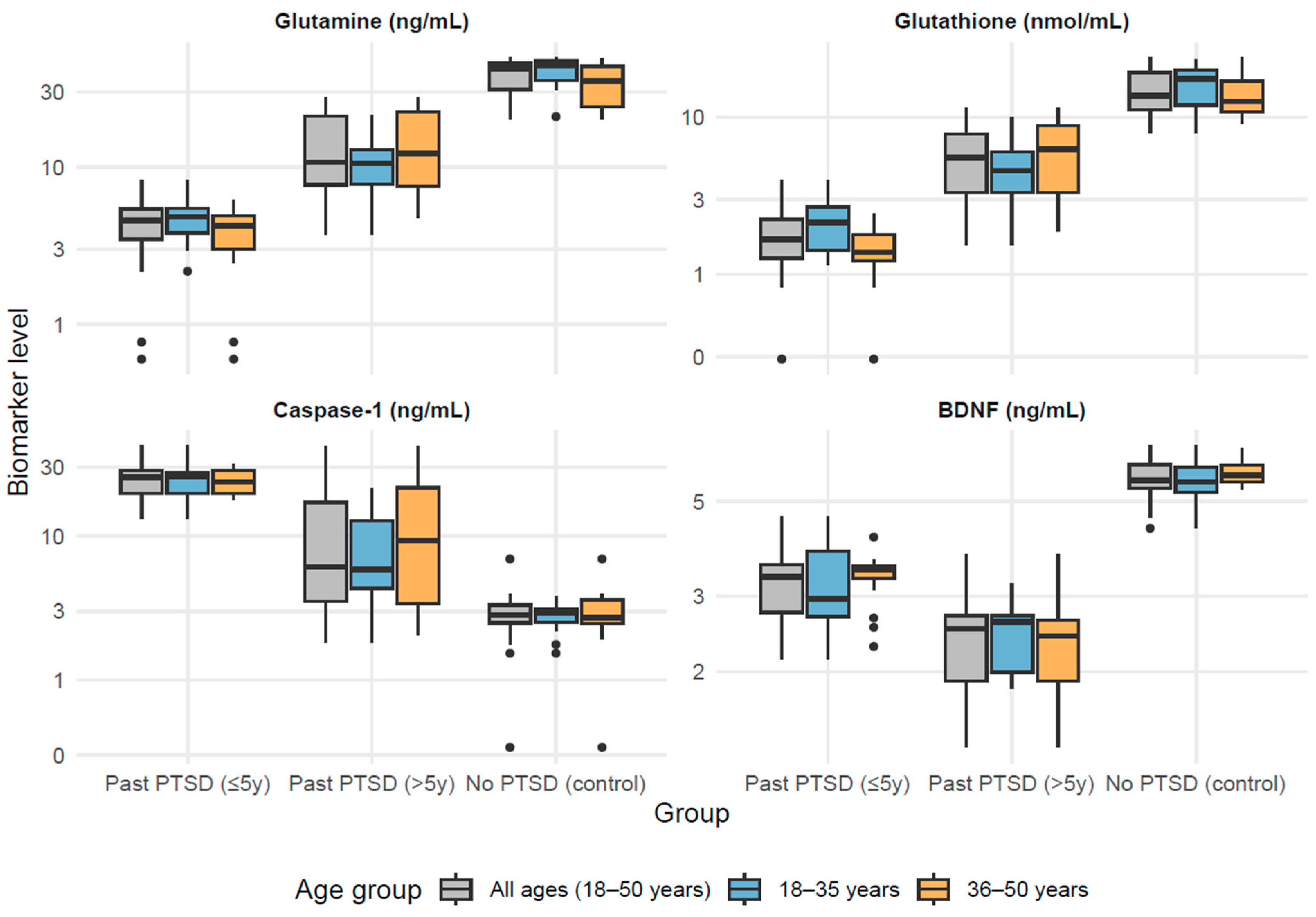Investigate the biomarker profiles of glutamine, glutathione (GSH), caspase-1 expression, and BDNF across the three groups (PTSD ≤ 5 y, PTSD > 5 y, and No PTSD), stratified by age (18–50 years, with subgroups 18–35 and 36–50 years), to assess variations associated with PTSD chronicity and age.