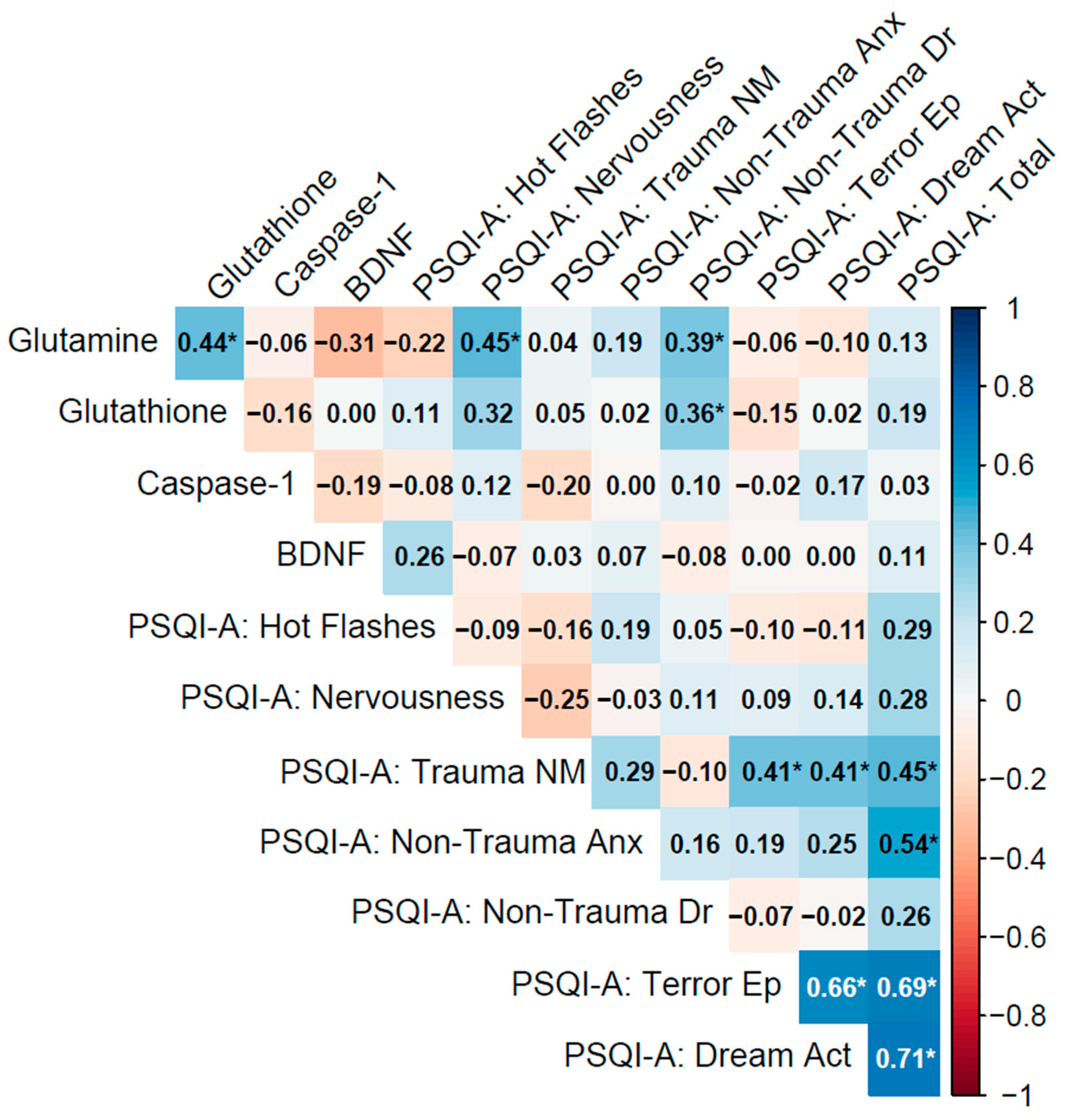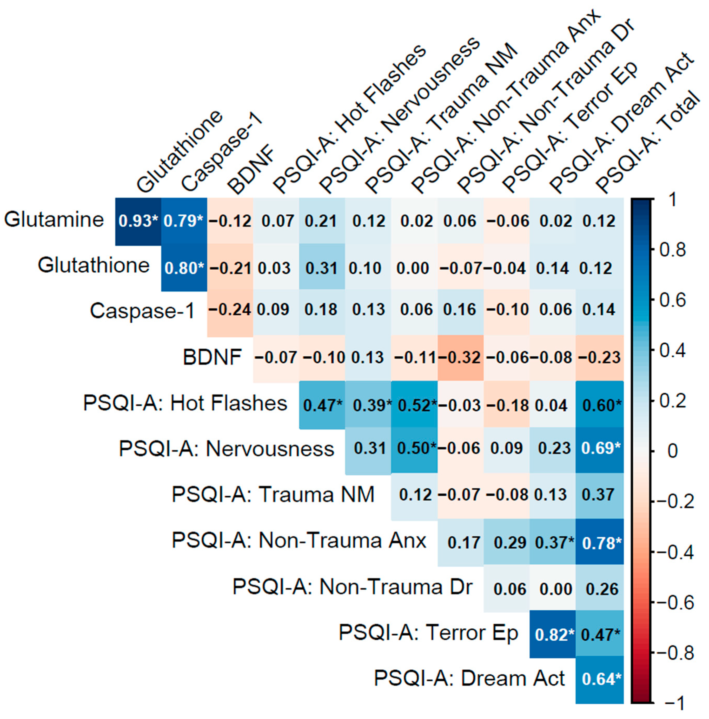 Biomarker–PSQI-A correlations were mostly weak, with glutamine showing significant associations with PSQI-A: Nervousness (ρ = 0.45, p = 0.009) and PSQI-A: Non-Trauma Dr (ρ = 0.39, p = 0.026), demonstrating that lower glutamine levels may exacerbate these sleep disturbances. BDNF correlations with PSQI-A domains were generally non-significant, such as with PSQI-A: Hot Flashes (ρ = 0.26, p = 0.14), indicating limited direct links to sleep disturbances in this group. Other correlations, such as caspase-1 with PSQI-A: Trauma NM (ρ = −0.20, p = 0.27), were non-significant.
