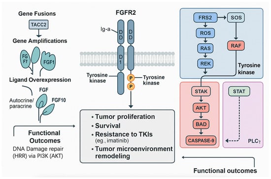 | FGFR2 amplifications | 1–2% [2,35,36] | Increased gene copy number → receptor overexpression and enhanced downstream signaling | Associated with higher tumor grade, aggressive behavior, and TKI resistance; potential biomarker for FGFR inhibitor sensitivity |